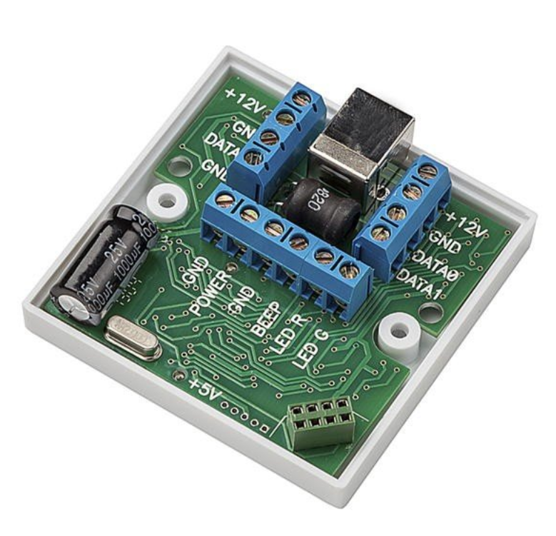 • В режиме терминала получает от считывателя прочитанный номер по Wiegand 26 и Dallas TM (для считывателя представляется контроллером), передает контроллеру номер по Wiegand 26 и Dallas TM (для контроллера представляется считывателем, управляет внешней индикацией считывателей, управляет 12 В питанием (до 150 мА).
