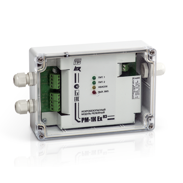 Релейный модуль РМ-1К Ex прот.R3 является связанным электрооборудованием (по ГОСТ 30852.10), имеет искробезопасную выходную цепь пуска уровня «ia» и выпускается в двух вариантах исполнения, отличающихся маркировкой взрывозащиты по подгруппе взрывоопасных смесей и соответственно выходными параметрами искрозащиты: «[Exiа]IIВ» и «[Exiа]IIС». Соответствует требованиям ГОСТ 30852.0, ГОСТ 30852.10 и устанавливается вне взрывоопасных зон помещений и наружных установок.