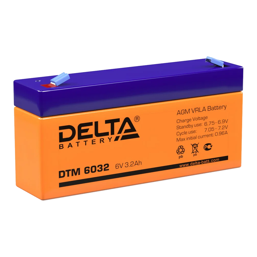 Герметизированный VRLA cвинцово-кислотный аккумулятор Delta DTM 6032 напряжением 6В и емкостью 3.2Ач изготовлен по технологии AGM (с микропористым заполнителем, пропитанным электролитом). Корпус изготовлен из негорючего ABS пластика. Срок службы аккумулятора рассчитан на 3-5 лет работы. Аккумулятор предназначен для работы в режиме постоянного подзаряда (т.н. буферный режим), обладает низким внутренним сопротивлением и саморазрядом.