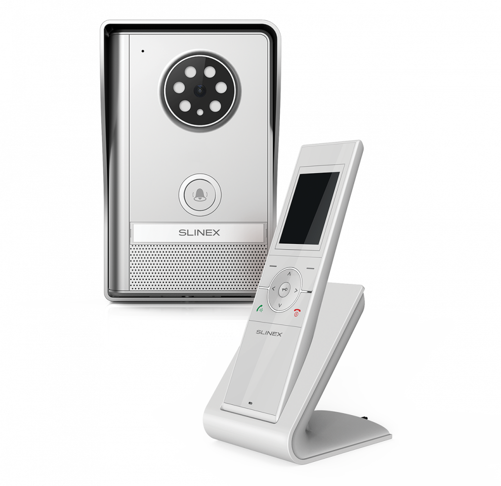 Комплект Slinex RD-30 состоит из вызывной видео панели и переносной видео трубки. Весь комплект выполнен в лаконичном дизайне и отлично впишется в любой интерьер, начиная от классики и до современных стилей. Кроме этого, вам также стоит задуматься о приобретении данного комплекта, если вы уже закончили ремонт и не планируете в ближайшее время его возобновлять. Данный комплект беспроводной и это означает, что вам не придется прокладывать дополнительные кабели для подключения панели и трубки.