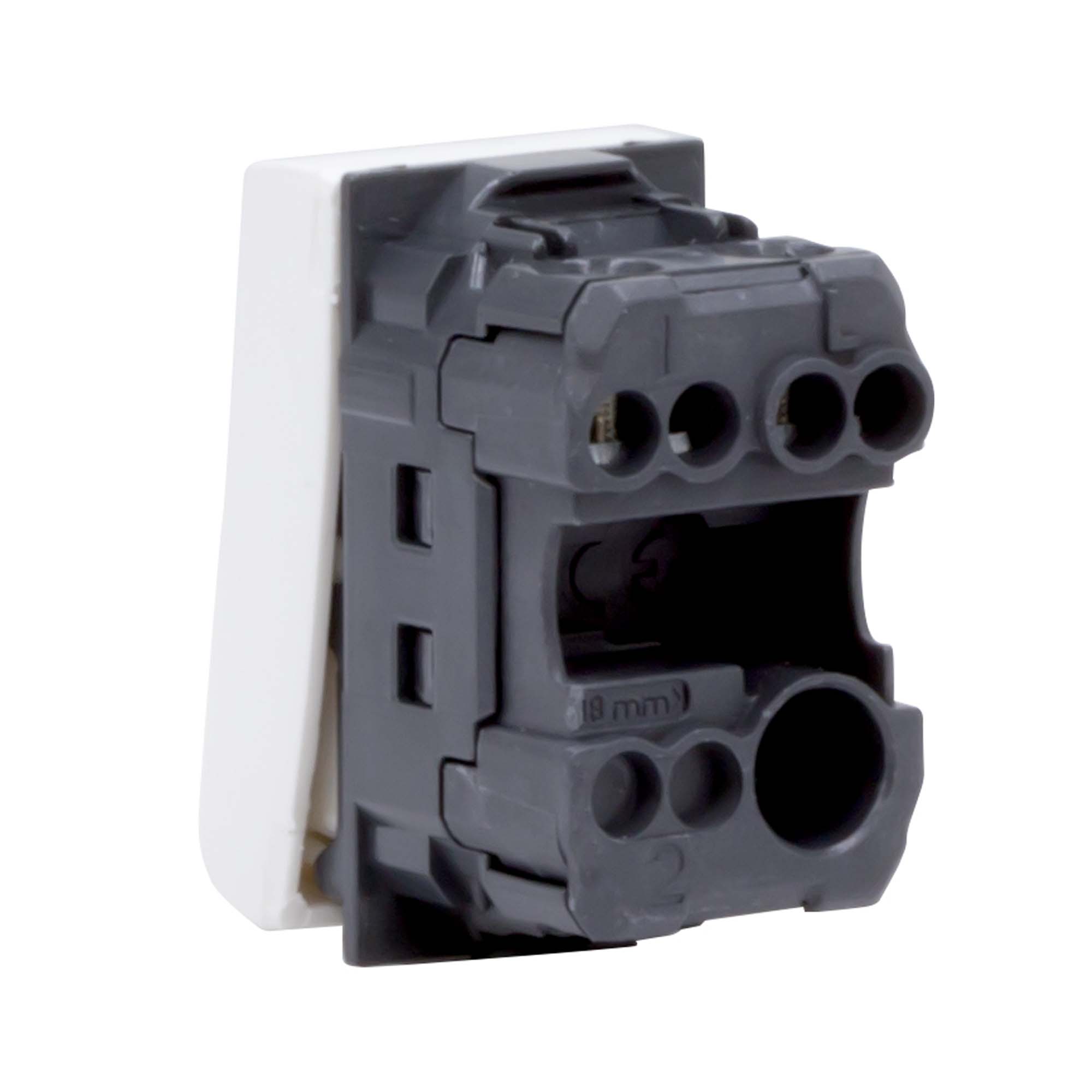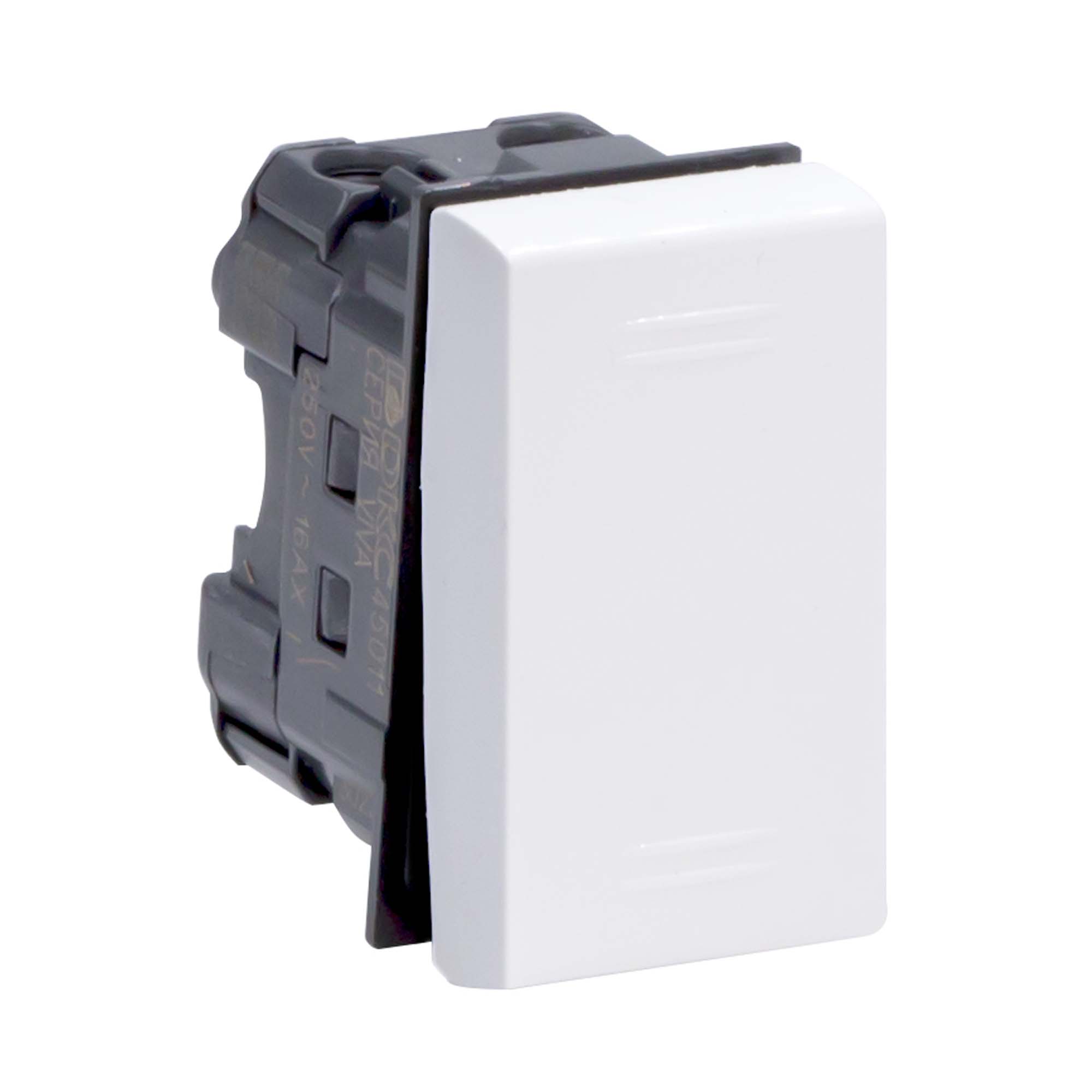 Выключатель 16 А, 250 B. Назначение: включение/выключение освещения. Характеристики: номинальный ток 16 А; номинальное напряжение 250 B; минимальный ресурс 100 тыс. циклов включения/выключения. Кол-во модулей: 1. Цвет: белый.