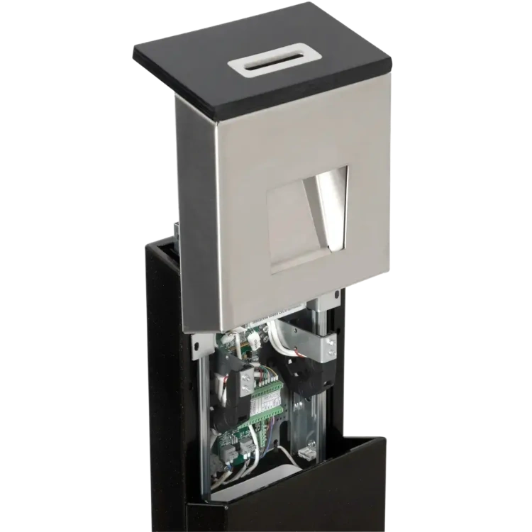 Крышка из полимерного радиопрозрачного материала (искусственный камень), нержавеющая сталь и полимерное покрытие (как у модели тумбового турникета 3V Model T / T(s)) обеспечили изделию сдержанный строгий стиль.