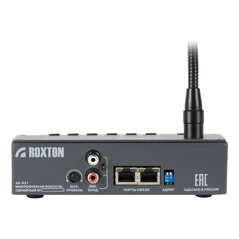 Микрофонная консоль ROXTON SX-R31 работает совместно с комбинированными системами ROXTON SX-240, ROXTON SX-480 и ROXTON SX-480N. Микрофонная консоль — это устройство, совмещающее в себе функции селектора зон, микшера и микрофона. Консоль ROXTON SX-R31 предназначена для выбора нужных зон (до 5 зон) и передачу в них речевого сообщения с микрофона или музыкального источника, подключенного к разъему на задней панели. Консоль осуществляет дистанционное управление комбинированной системой ROXTON SX-240/480, в заданном приоритете (1~4 приоритеты). Приоритеты означают, что консоль с высшим приоритетом, прерывает (блокирует) работу консоли с низшим (меньшим) приоритетом. Приоритет консоли соответствует ее адресу. Питание консоли осуществляется от комбинированной системы по информационному кабелю. Конструктивно блок выполнен в металлическом корпусе в настольном исполнении.