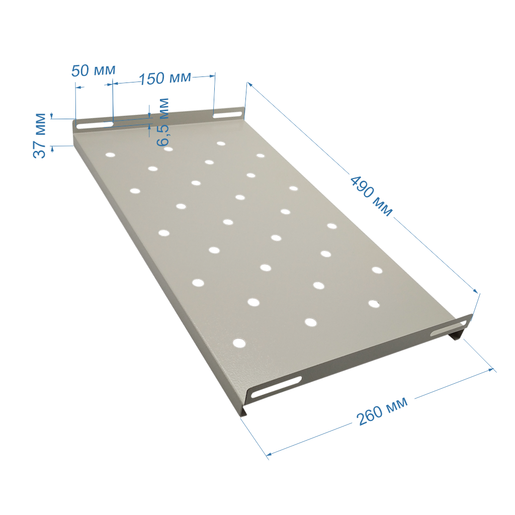 Полка ST-SH 260×490 (серая), для телекоммуникационных шкафов ST-NC9U600 и ST-NC12U600 предназначена для размещения на ней внутри шкафа оборудования, приборов и аппаратуры, не имеющих кронштейнов и уголков крепления на 19» профили.