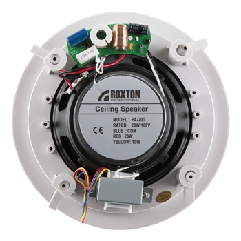 Потолочный двухполосный громкоговоритель ROXTON PA-20T сочетает в себе отличные акустические характеристики и удобство монтажа, что делает его незаменимым при построении систем речевого оповещения и музыкальной трансляции в офисных, торговых и других помещениях общественного назначения. Имея врезное исполнение, ROXTON PA-20T характеризуется способом излучения, при котором звуковая энергия направлена перпендикулярно полу, что позволяет обеспечивать равномерное звуковое покрытие при монтаже в потолок. Громкоговоритель оборудован специальными поворотными защёлками, значительно облегчающими его монтаж в горизонтальные поверхности. Встроенный трансформатор с отводами позволяет устанавливать значения мощности 10 или 20 Вт. Отличительной особенностью ROXTON PA-20T является двухполосное исполнение с применением пассивного разделительного фильтра второго порядка.