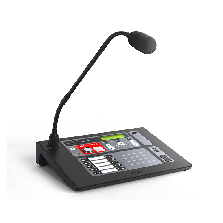 Пульт микрофонный СОУЭ Sonar SRM. Sonar SRM-7010: 10 зон, подключение к моноблокам SPM-B, SPM-С по интерфейсу DAP, доп. вход питания 24 В, прием сигнала АВАРИЯ (сухой контакт) от ИВЭПР