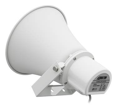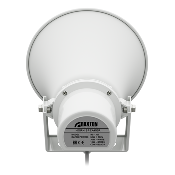 Рупорный громкоговоритель ROXTON HS-30T мощностью 30 Вт сочетает в себе хорошие акустические характеристики и удобство монтажа, что делает его незаменимым при построении систем речевого оповещения и музыкальной трансляции складов, вокзалов, парков и спортивных площадок. Выполненный из алюминия, громкоговоритель обеспечивает высокое звуковое давление вкупе с высокой направленностью звукового излучения. Громкоговоритель оборудован специальным П-образным металлический кронштейном, значительно облегчающим монтаж на различные поверхности. Встроенный трансформатор с отводами позволяет устанавливать значения мощности 15 или 30 Вт. Отличительными особенностями ROXTON HS-30T является высокая направленность излучения звуковых волн с максимальным углом раскрытия 90° на частоте 1кГц, а так же уличным исполнением с высокой степенью защиты IP66.