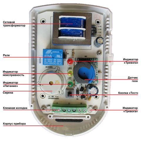 2. при превышении порогового уровня концентрации контролируемого газа срабатывает световой извещатель красного цвета, звучит сигнал сирены, подается сигнал для срабатывания клапана, срабатывает реле управления внешними устройствами;