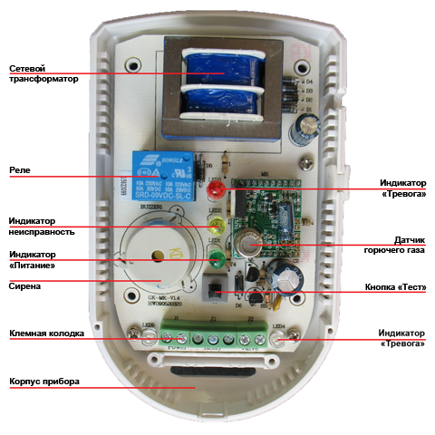 2) при превышении порогового уровня концентрации контролируемого газа срабатывает световой извещатель красного цвета, звучит сигнал сирены, подается сигнал для срабатывания клапана, срабатывает реле управления внешними устройствами;