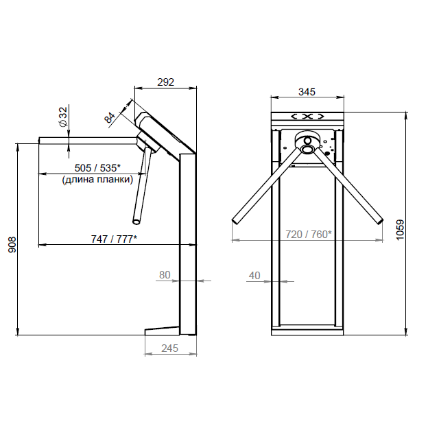 Габаритные размеры турникета без установленных преграждающих планок, ДхШхВ 292х345х1059 мм