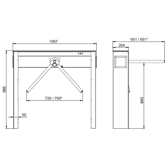 Габаритные размеры турникета без установленных преграждающих планок, ДхBхШ 204х997х1067 мм