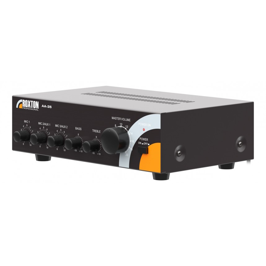 Трансляционный микшер-усилитель ROXTON AA-35 мощностью 35 Вт это решение начального уровня для построения несложных систем речевого оповещения и музыкальной трансляции. В первую очередь он предназначен для озвучивания помещений небольшой площади. Два линейных и три микрофонных аудиовхода на задней панели дают широкий выбор источников аудиосигнала, а дополнительные низкоомные аудиовыходы позволяют подключать к усилителю акустические системы бытового и профессионального уровней.