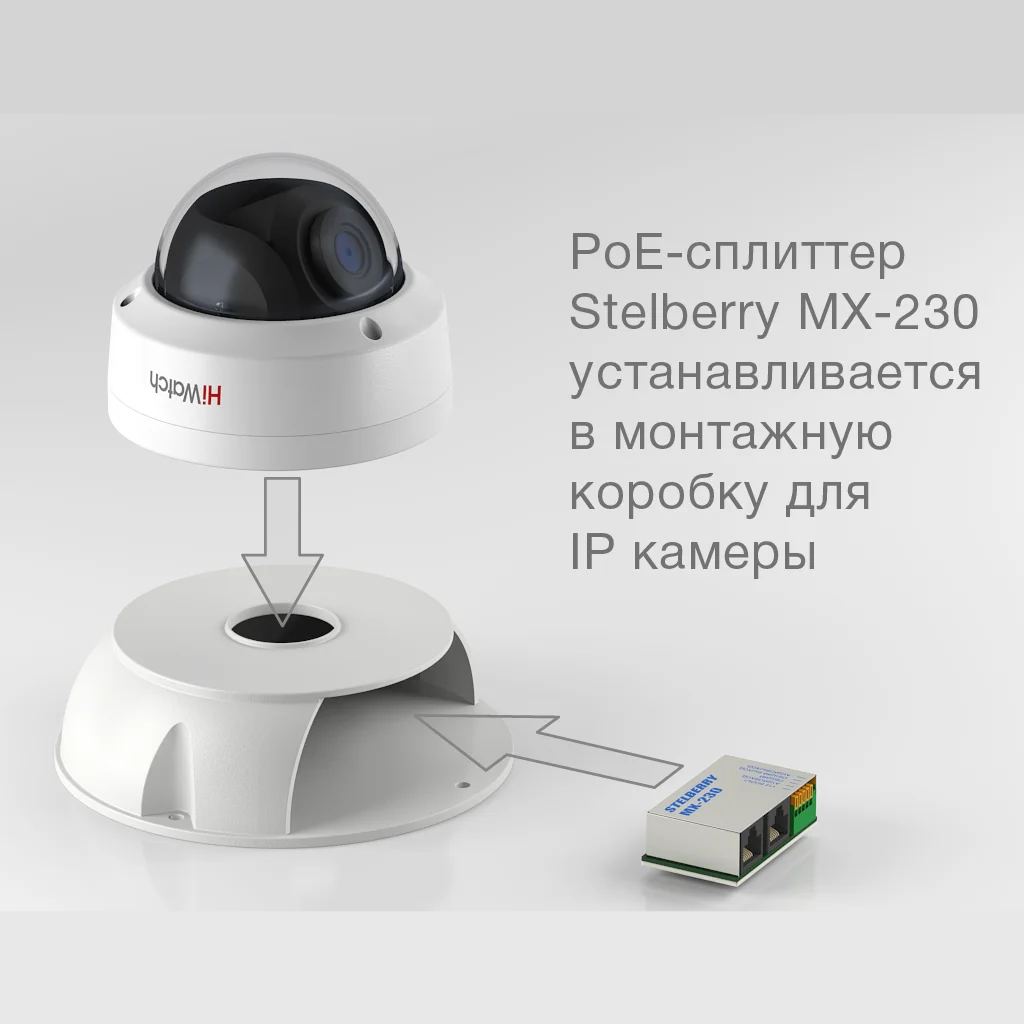 Проходной PoE-сплиттер STELBERRY MX-230 разработан специально для установки в монтажные коробки для IP-камер.