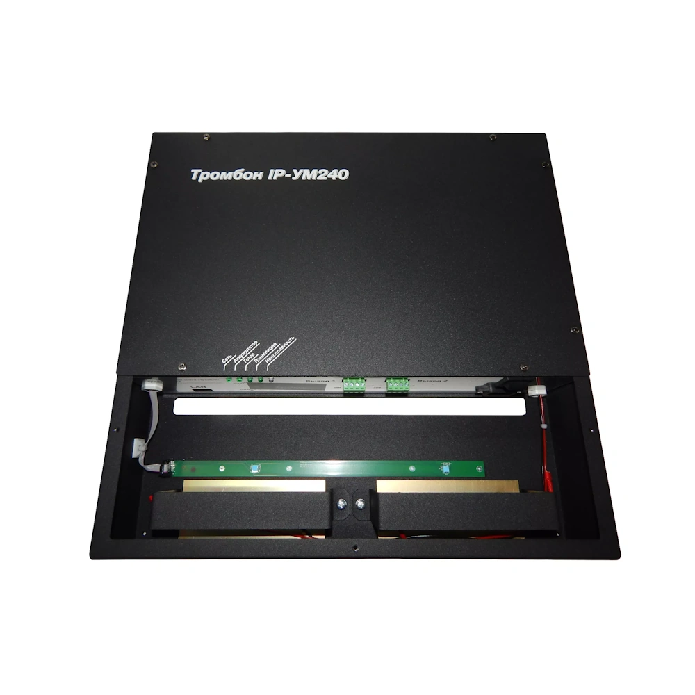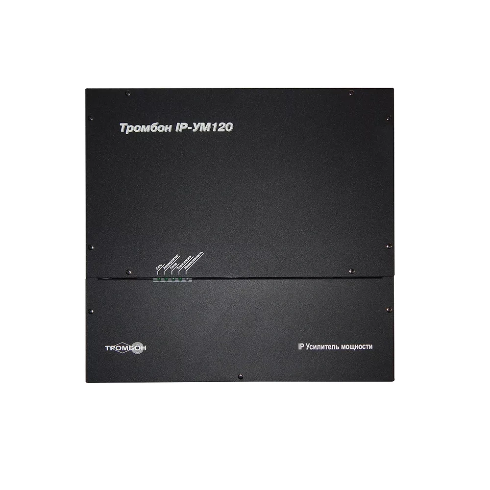 Усилитель мощности «Тромбон IP-УМ240» предназначен для работы в составе системы звукового вещания и систем оповещения и управления эвакуацией «Тромбон IP». Усилитель мощности предназначен для приёма голосовых, звуковых, тревожных и иных сообщений от пультов звукового вещания «Тромбон IP-ПЗВ», модуля оповещения «Тромбон IP-МО8″и прочих устройств управления по сетям TCP/IP; приёма цифрового звукового контента, декодирования и воспроизведения на оконечные устройства речевые оповещатели по линиям трансляции. Усилитель осуществляет контроль линий речевого оповещения, в случае использования в составе систем СОУЭ и/или прочих систем требующих обязательного контроля. Усилитель мощности оснащён системой резервного питания. Номинальная выходная мощность 240 (2×120) Вт, диапазон воспроизводимых частот 68-20000Гц, выходное напряжение 30, 100 В, основное питание 220В(AC) / резервное питание 24В(DC), потребляемая мощность от сети переменного тока 330 Вт, навесного исполнения, габариты 480*430*100 мм, вес 14 кг (без АКБ).