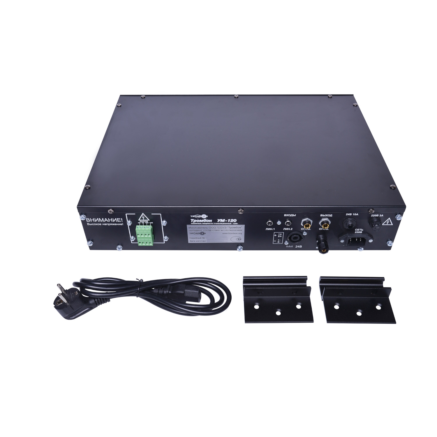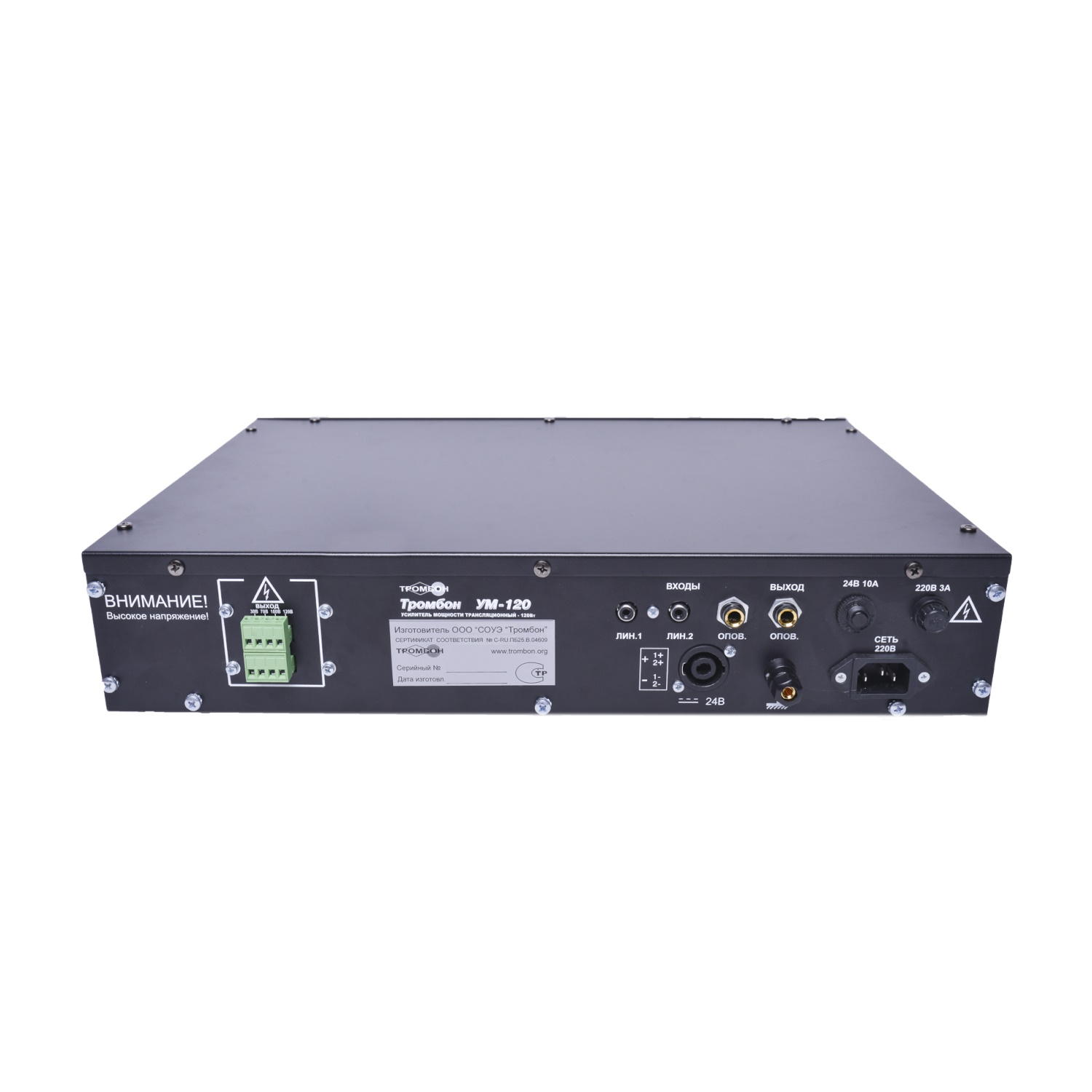 Усилитель мощности «Тромбон УМ-120» предназначен для использования в составе систем оповещения людей о пожаре в зданиях и сооружениях. Усилитель может применяться в системах звукового вещания и радиотрансляции. Номинальная выходная мощность 120 Вт, диапазон воспроизводимых частот 100-20000Гц, выходное напряжение 30, 70, 100, 120 В, 1 микрофонный вход, 2 линейных входа, 1 вход оповещения, 1 выход оповещения, основное питание 220В(AC) / резервное питание 24В(DC), потребляемая мощность от сети переменного тока 150 Вт, высота корпуса 2U 19″ для установки в стойку или настольного исполнения, габариты 483*285*88 мм, вес 7,5 кг. Усилитель имеет встроенную защиту от перегрузки. В качестве источников резервного питания рекомендуется блок резервного питания Тромбон БП-07.